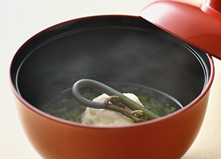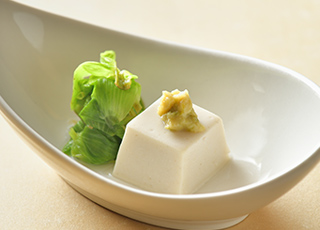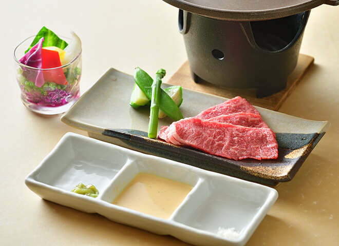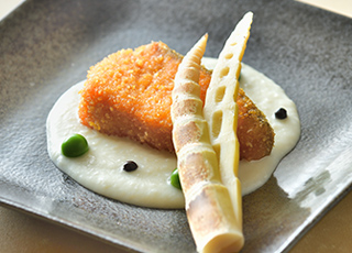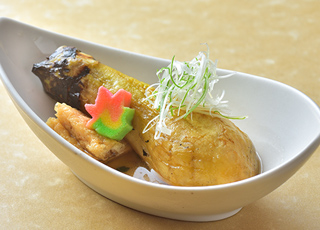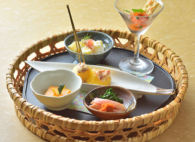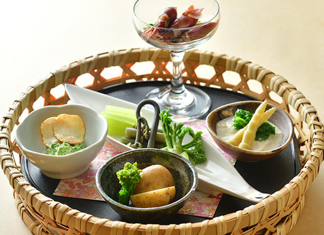 新潟・妙高高原ならではの食の魅力。四季に応じて変わる地野菜をふんだんに使用した季節の逸品料理。献立は三ヶ月ごとに更新しますので、その季節ごとの料理を楽しめます。そして「のっぺ」「笹箕ずし」など、自慢の郷土料理もご用意いたします。また、高級魚「のどぐろ」や旬の「地魚」、新潟ブランド牛「越後牛」を、食材の良さを活かした様々な料理でお召し上がりいただけます。