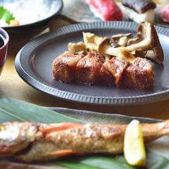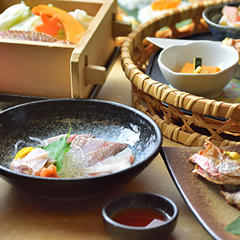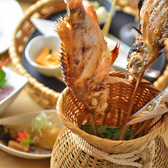 - その日に仕入れた一番美味しい魚のこだわりの料理。メインの「びく立ての焼き魚」は、日本海で揚がった魚本来の持つ美味しさを味わっていただくため、塩焼きで一つ一つ違った魚をお出しします。