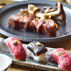 - 新潟の豊かな気候と風土に育てられたブランド牛「越後牛」を「ステーキ」と「炙りにぎり3種」で召し上がり方でお楽しみください。