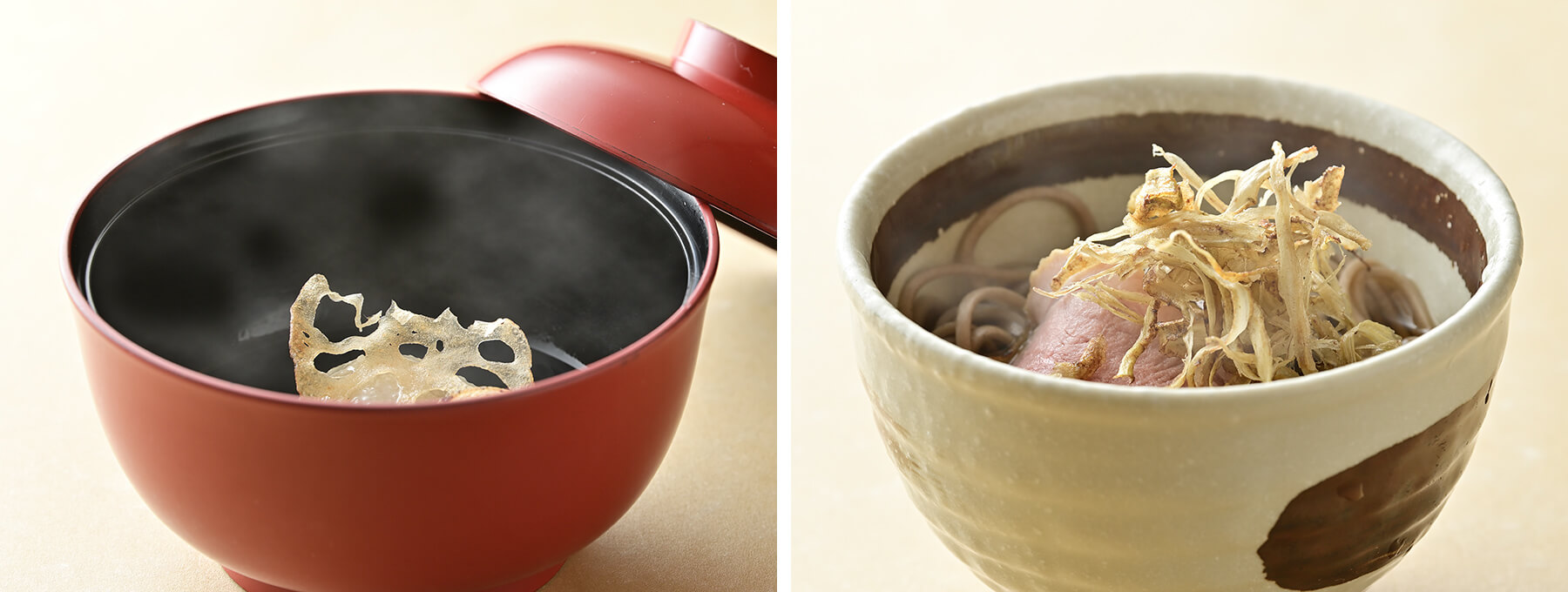 脂の乗った「のどぐろ」を季節の地魚と合わせて盛り付けた「薄づくり」は、妙高特産の香辛料「かんずり味噌」に「ポン酢ジュレ」「ワサビ」などの薬味でお召し上がりください。