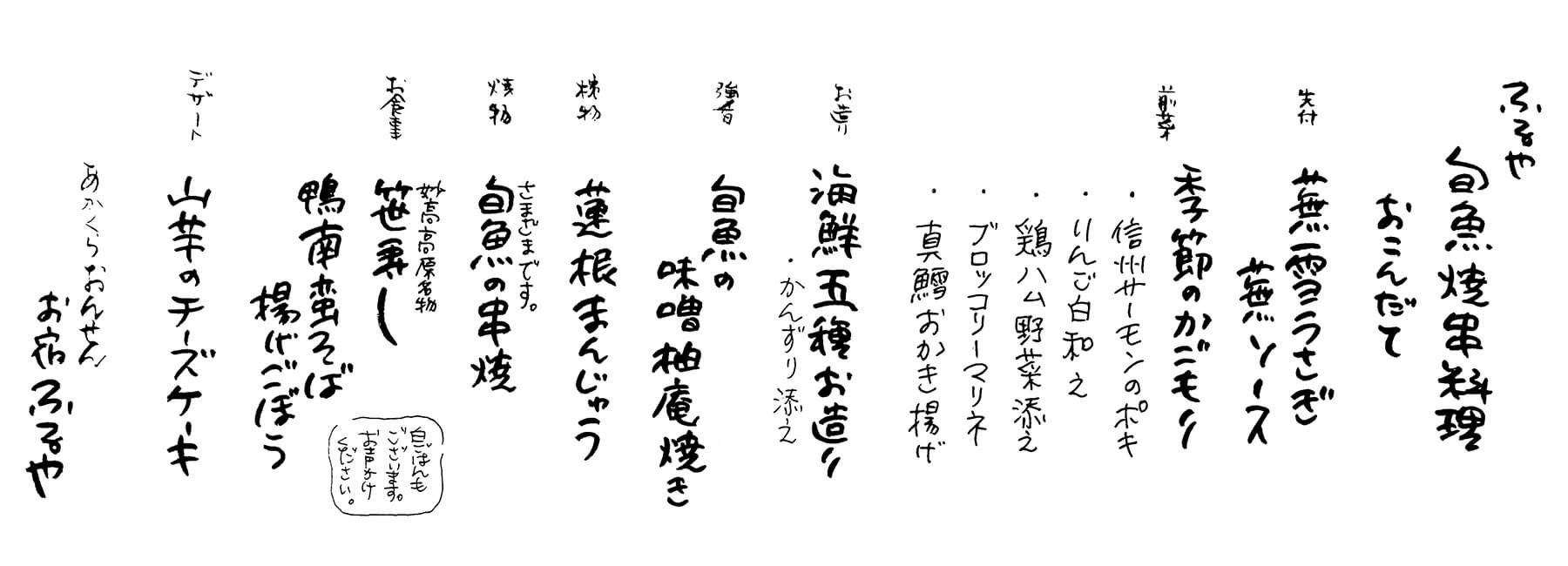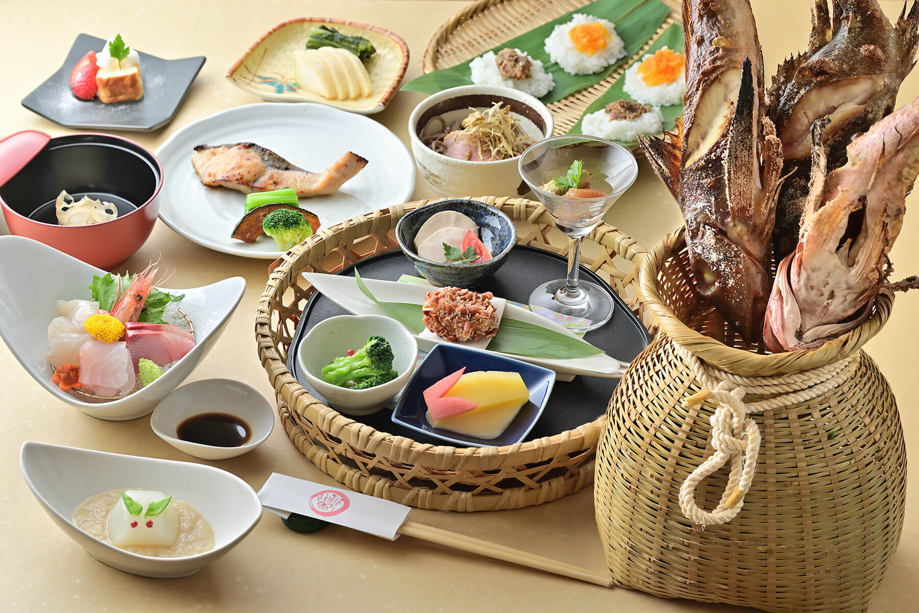 「旬魚焼串プラン」は、新鮮な地魚づくしの献立です。香ばしく焼き上げる「旬魚の焼串」をはじめ「お造りの盛合せ」やヘルシーな「せいろ蒸し」が並びます。「ふるや」自慢の地元食材をふんだんに使用した郷土料理とともにお楽しみください。