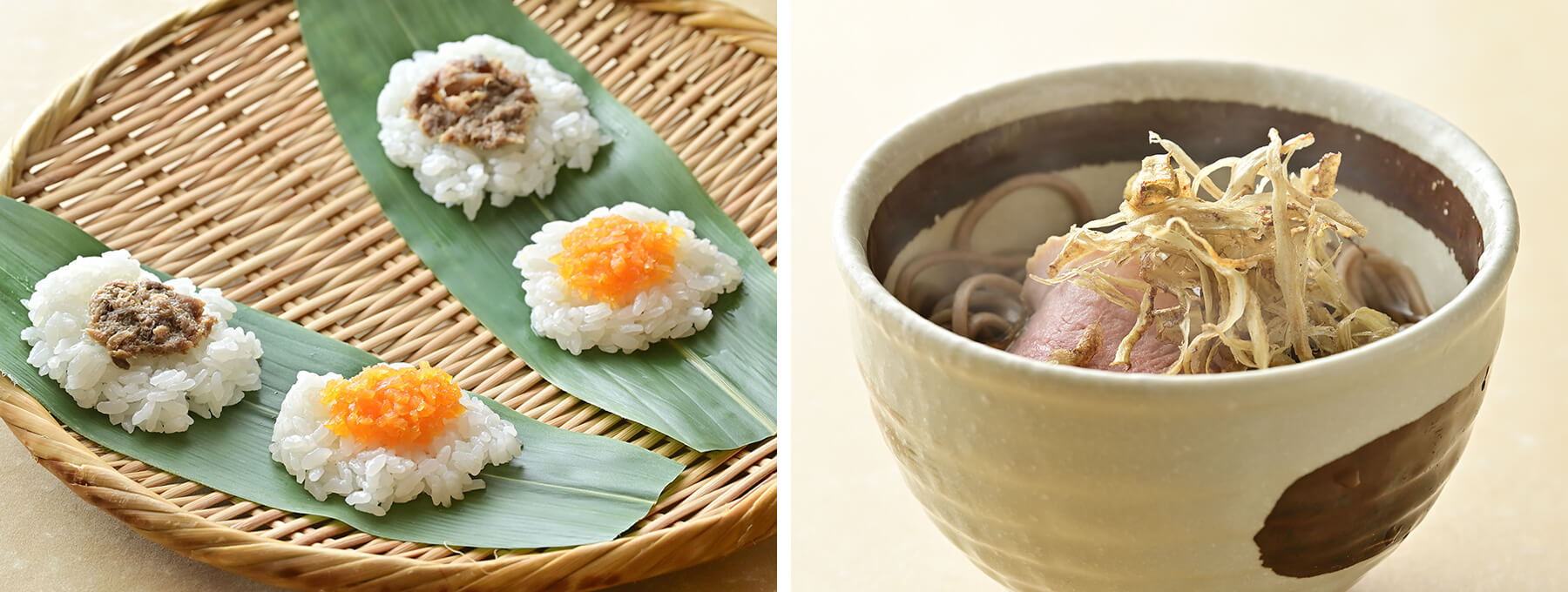笹ずしは妙高の郷土料理で、笹に酢飯を乗せ、その上に味付けした山菜や、にんじんをのせた一口サイズの寿司です。※写真は2人前です。