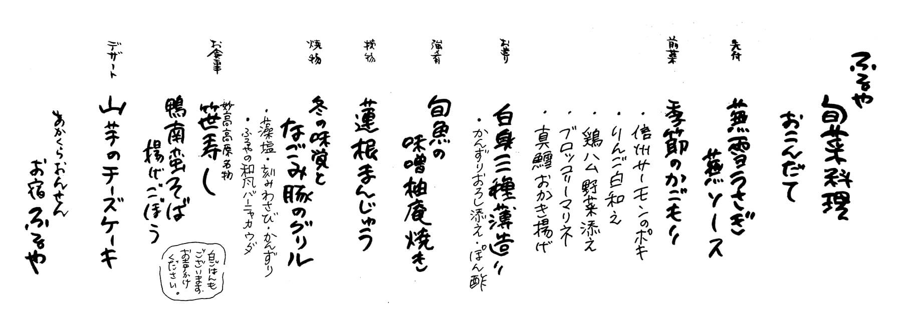 妙高高原で採れた野菜を使った料理が中心の「旬菜プラン」は、ふるやのスタンダードな献立です。季節ごとに変わる野菜料理とともに、郷土料理の「笹ずし」もご用意いたします。ボリュームはありますが、野菜中心のヘルシーな献立です。