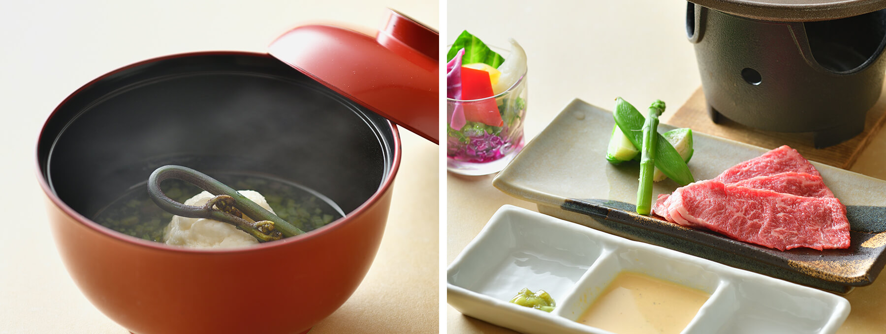 〈国産牛の陶板焼き 春野菜 和風バーニャカウダ〉