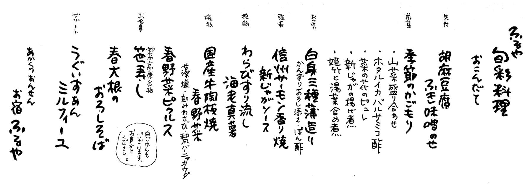 妙高高原で採れた野菜を使った料理が中心の「旬彩プラン」は、ふるやのスタンダードな献立です。季節ごとに変わる野菜料理とともに、郷土料理の「笹ずし」もご用意いたします。ボリュームはありますが、野菜中心のヘルシーな献立です。